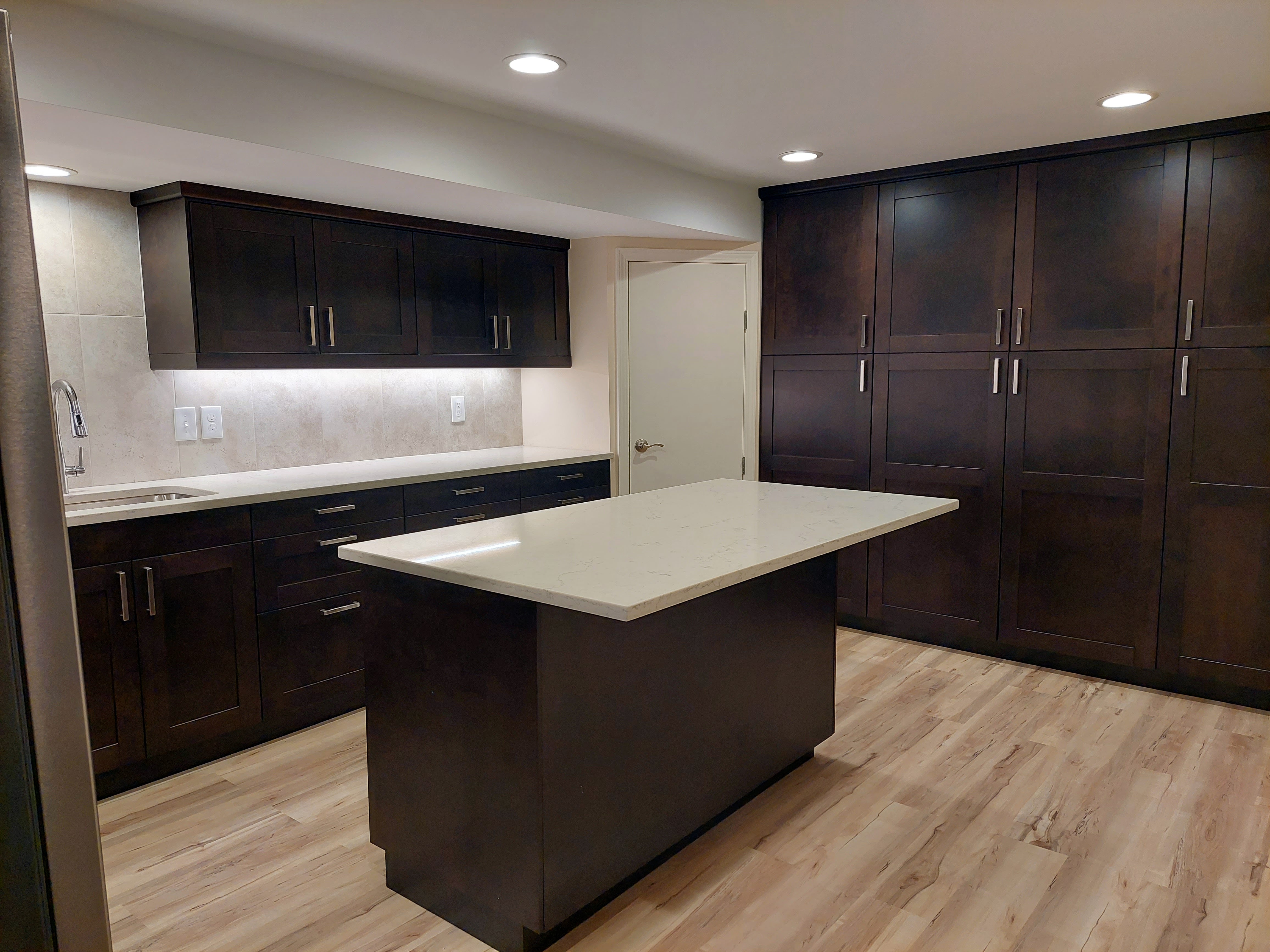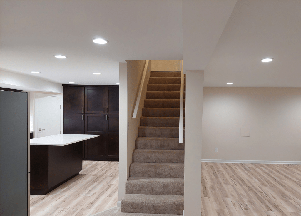 This 2,000 square foot basement was transformed into a family destination. The previously unfinished basement was converted into a living room, recreation area, kitchen, bathroom, and bedroom – doubling the house’s living space. Sound dampening materials were incorporated to separate movie night and other activities from the main floor of the house. With the added privacy, this basement has become a place for entertainment and visiting relatives to enjoy all the comforts of home. Additional features include a radiant heated floor in the bathroom, an egress window in the bedroom, updated HVAC, ample kitchen cabinet and drawer space, and a 400 square foot room for organized storage.